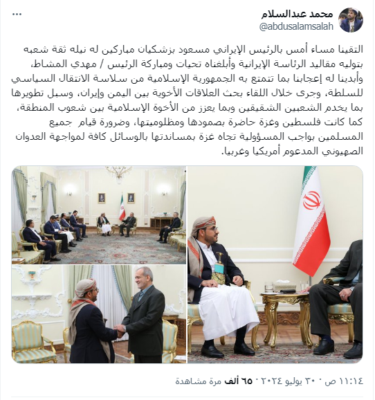 وكان رئيس الوفد الوطني محمد عبدالسلام قد وصل إلى طهران للمشاركة في مراسم تنصيب الرئيس الإيراني مسعود بزشكيان.