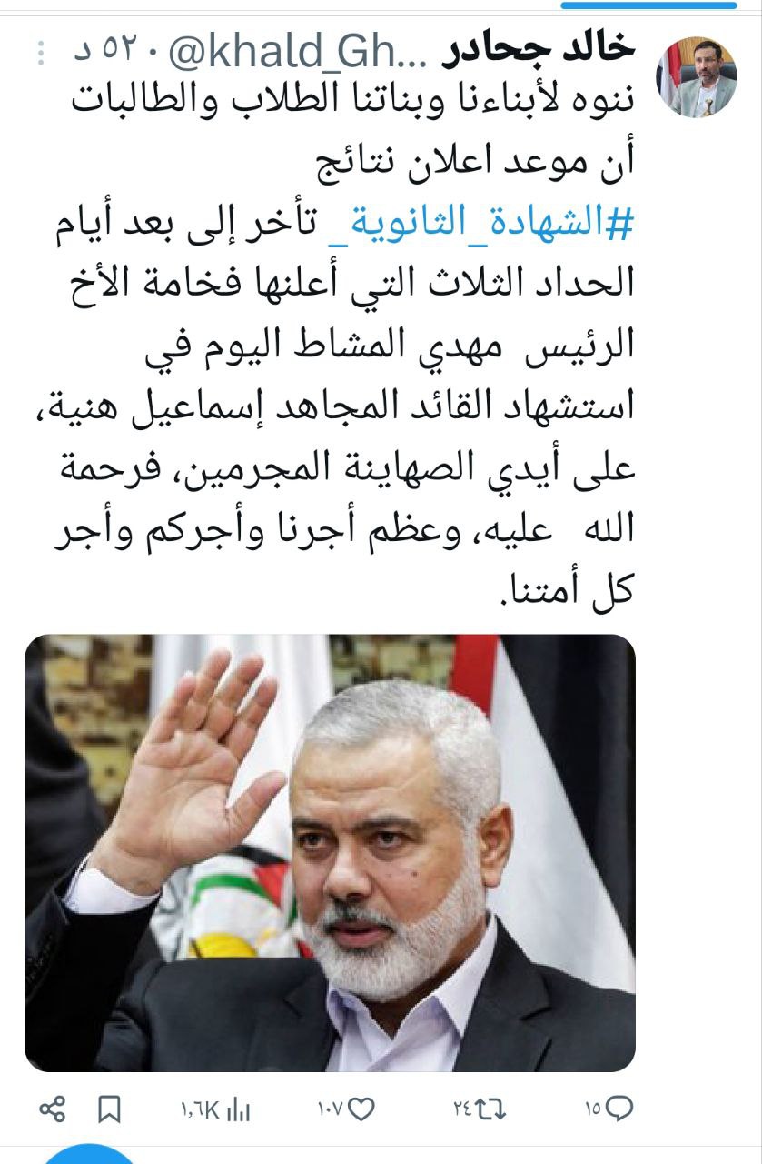 جاء ذلك في تغريدة له على حسابه الشخصي في منصة إكس حيث قال: “ننوه لأبنائنا وبناتنا الطلاب والطالبات أن موعد اعلان نتائج الشهادة الثانوية تأخر إلى بعد أيام الحداد الثلاث التي أعلنها فخامة الأخ الرئيس مهدي المشاط اليوم في استشهاد القائد المجاهد إسماعيل هنية، على أيدي الصهاينة المجرمين، فرحمة الله عليه، وعظم أجرنا وأجركم وأجر كل أمتنا”.