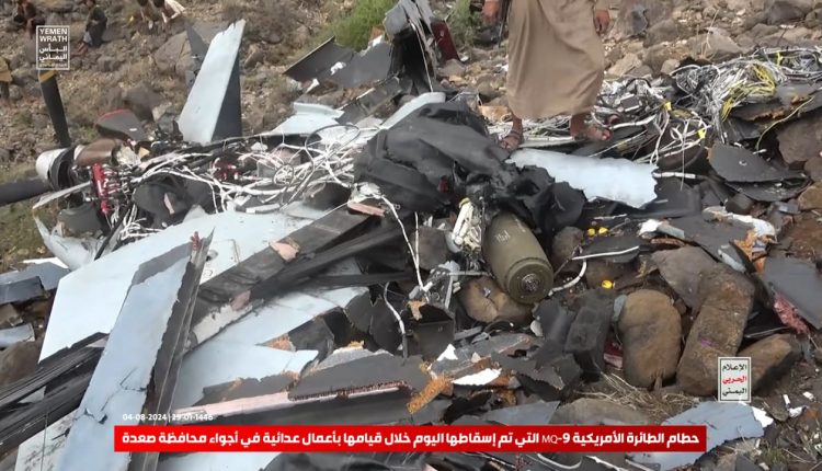 مشاهد حطام الطائرة الأمريكية MQ9 التي تم إسقاطها بصاروخ أرض جو في أجواء محافظة صعدة (فيديو)