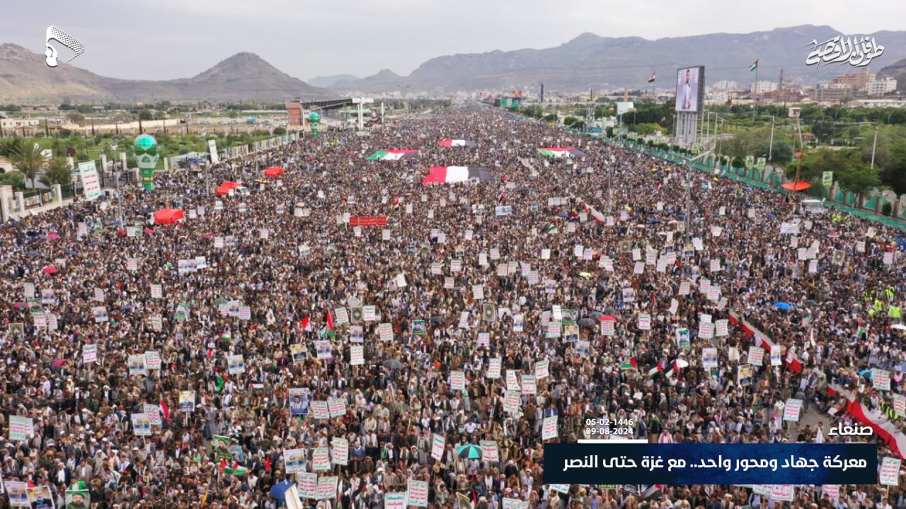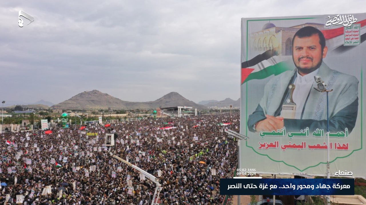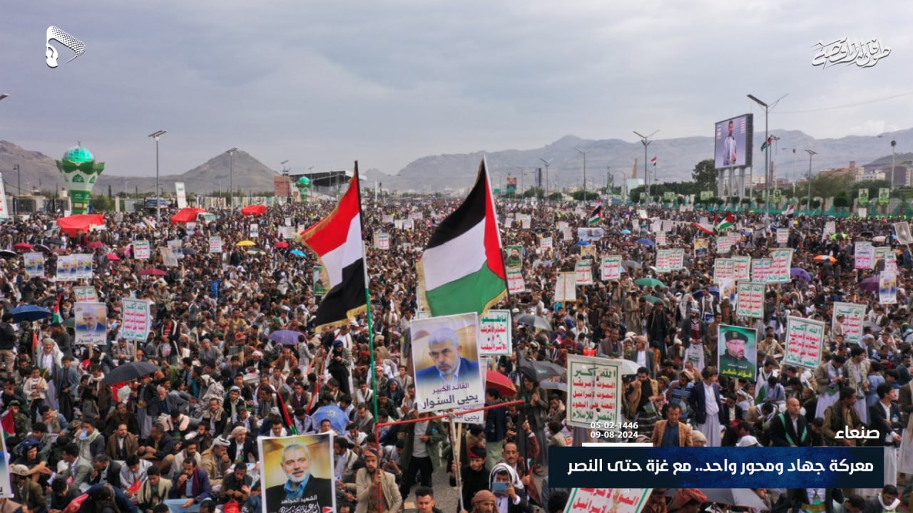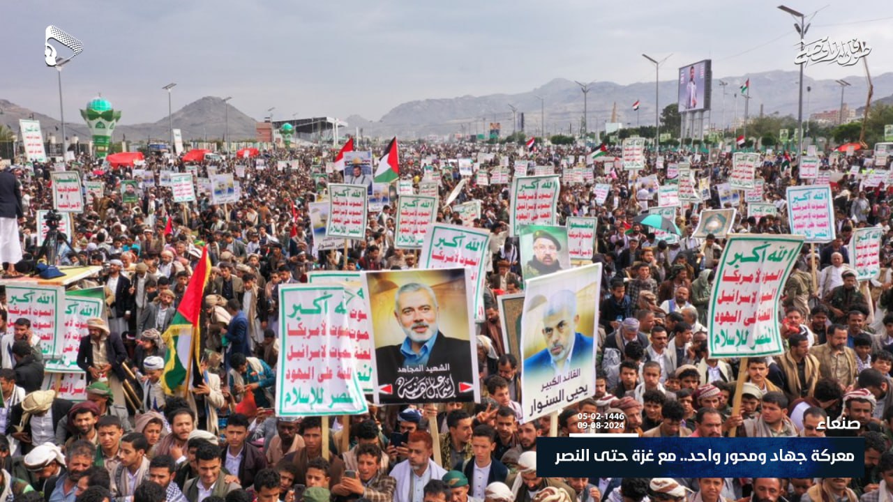 شاهد| دعماً وإسناداً للقائد “يحيى السنوار” وشعب فلسطين ومجاهديه، وتأكيداً بأن الرد قادم… حشود مليونية في مسيرة “معركة جهاد ومحور واحد.. مع غزة حتى النصر” في ميدان السبعين بالعاصمة صنعاء 05-02-1446هـ | 09-08-2024م