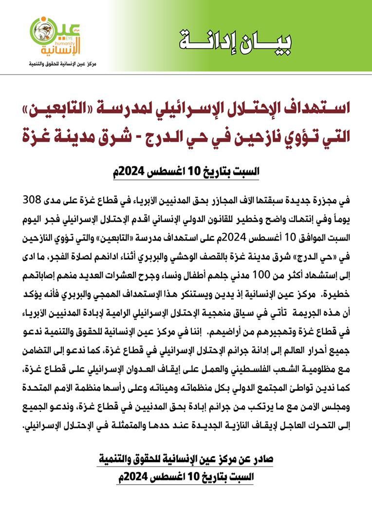 أدان مركز عين الإنسانية للحقوق والتنمية استهداف قوات الاحتلال الإسرائيلي فجر اليوم السبت، لمدرسة “التابعين” التي تأوي نازحين في حي الدرج شرق مدينة غزة أثناء أدائهم صلاة الفجر، ما أدى إلى استشهاد اكثر من 100 مدني جلهم من الأطفال والنساء، وجرح العشرات اغلبهم إصاباتهم خطيرة.