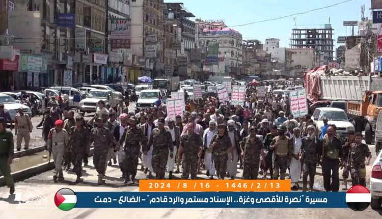 وأكد أبناء الضالع ثباتهم على الموقف المساند للشعب الفلسطيني ونصرة قضيته العادلة وإسناد مقاومته الباسلة.