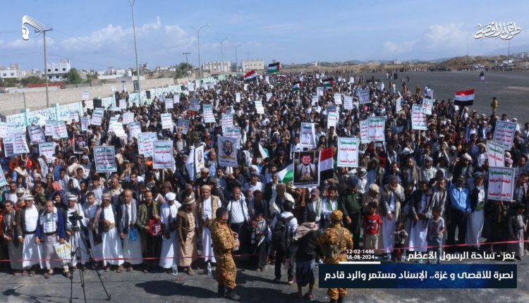 احتشد أبناء محافظة تعز اليوم في 11 ساحة في مسيرات “نصرة للأقصى وغزة .. الإسناد مستمر والرد قادم”، استمراراً للتضامن مع الشعب الفلسطيني ونصرة قضيته ودعم مقاومته.