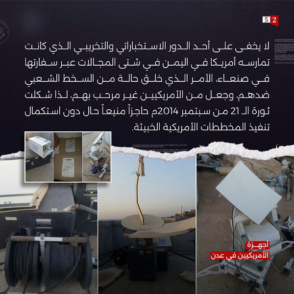 وفي هذا المسلك يؤكد الجاسوس الهمداني أن “السفارة الأمريكية بشكل عام كثفت نشاطها الاستخباراتي بشكل كبير جداً على الملف العسكري والأمني والسياسي والاقتصادي بعد مغادرتها للعاصمة صنعاء، وذلك من خلال أذرعها والمتعاونين معها الذين تم تجنيدهم وبناء العلاقات معهم خلال طيلة الفترات الماضية”.