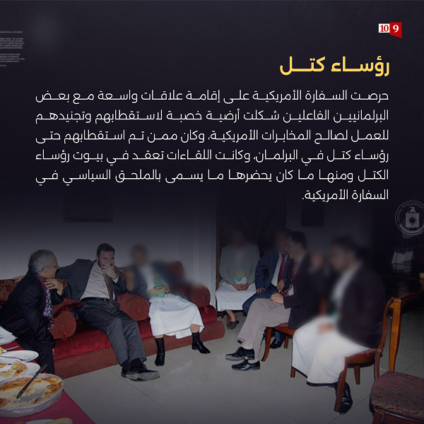 ويضيف:”كان لدينا القناعة الراسخة بأن معظم النخب السياسية والعسكرية وأقطاب النظام والشخصيات الحقوقية والناشطين والناشطات، تحركهم السفارة الأمريكية، وأن ثمة مخططات وأجندات تدميرية أمريكا تشتغل عليها، وتديرها سفارتها عبرهم، ونلمس ذلك جلياً بحكم احتكاكنا بهم”.