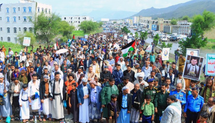 شهدت محافظة تعز اليوم، حشوداً جماهيرية في 11 ساحة بمديريات المحافظة، في مسيرات “مع غزة والأقصى .. جهاد وثبات حتى النصر”، تضامناً مع الشعب الفلسطيني وإسناداً للمقاومة في قطاع غزة.