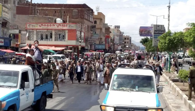 وجاب المسير الذي تقدمه عضو مجلس الشورى عادل الحنبصي وقيادات محلية وتنفيذية وأمنية ومشايخ وشخصيات اجتماعية وعقال ولجان مجتمعية، عدداً من الشوارع وصولاً إلى جولة الصرخة بشارع المطار، ورفع المشاركون العلمين اليمني والفلسطيني.