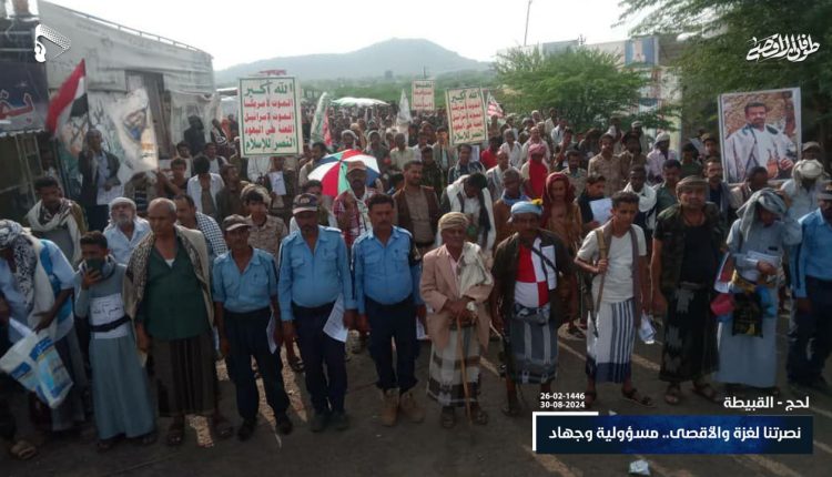 احتشد أبناء مديرية القبيطة بمحافظة لحج اليوم، في مسيرة حاشدة تحت شعار “نصرتنا لغزة والأقصى.. مسؤولية وجهاد”، تضامنا مع الشعب الفلسطيني.