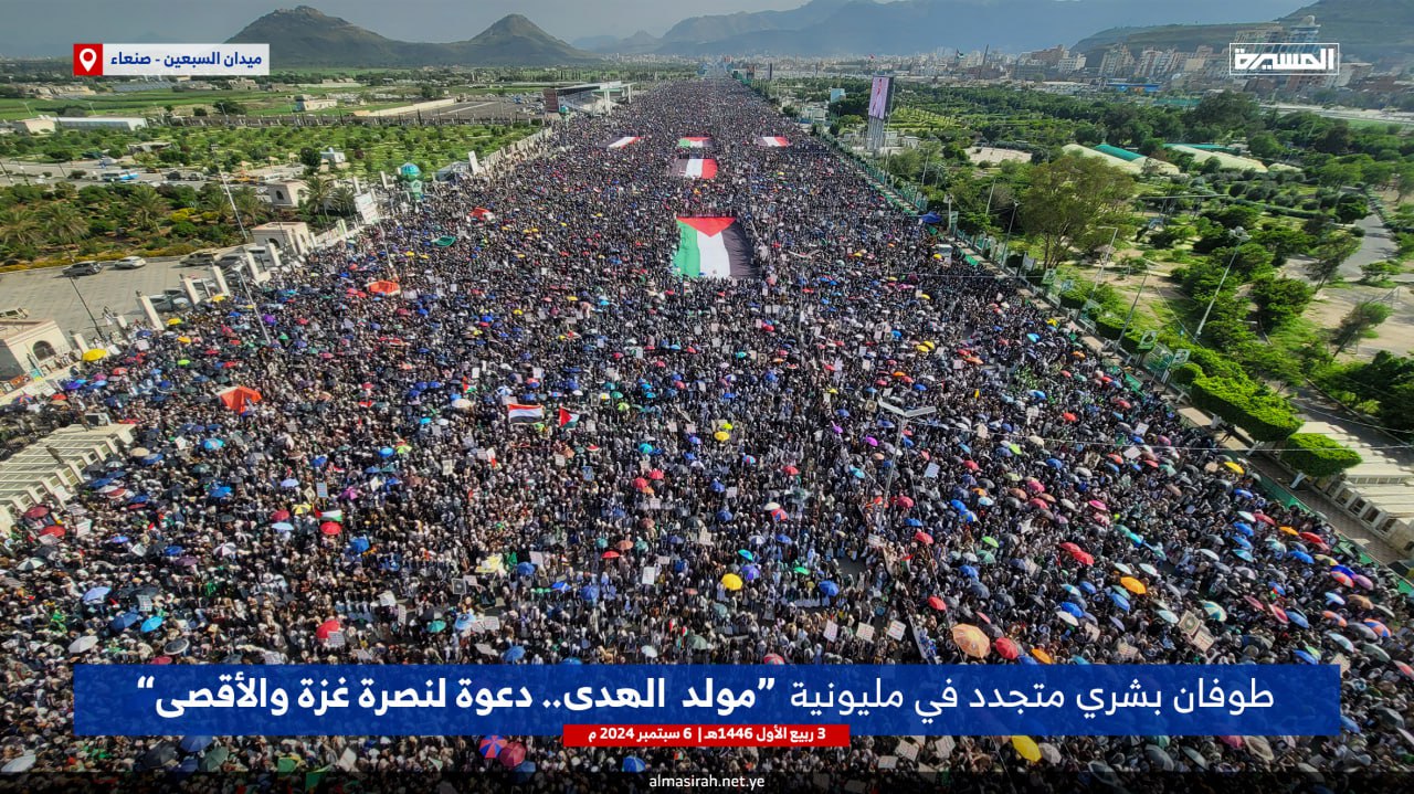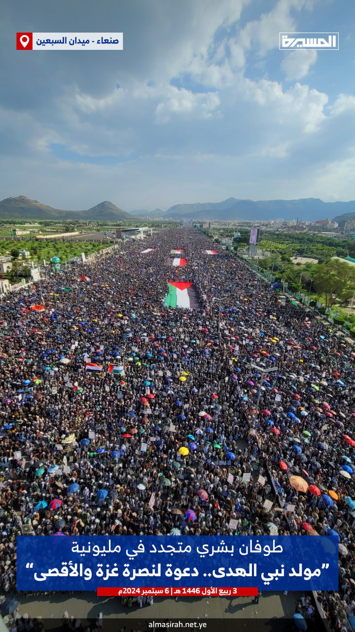 صور جوية| جهاداً في سبيل الله، ووفاءً لرسوله، ونصرةً وإسناداً للشعب الفلسطيني.. طوفان شعبي مليوني في مسيرة “مولد نبي الهدى.. دعوة لنصرة غزة والأقصى” بميدان السبعين في العاصمة صنعاء 03-03-1446هـ | 06-09-2024م