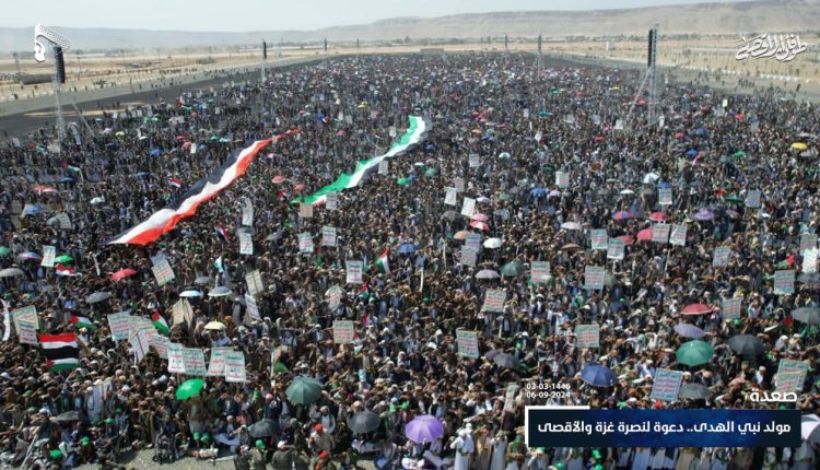 شهدت محافظة صعدة، اليوم الجمعة، مسيرات جماهيرية حاشدة في 26 ساحة بمختلف مديريات ومناطق المحافظة في مظاهرات أسبوعية متجددة إسنادا لفلسطين تحت شعار “مولد نبي الهدى.. دعوة لنصرة غزة والأقصى”.