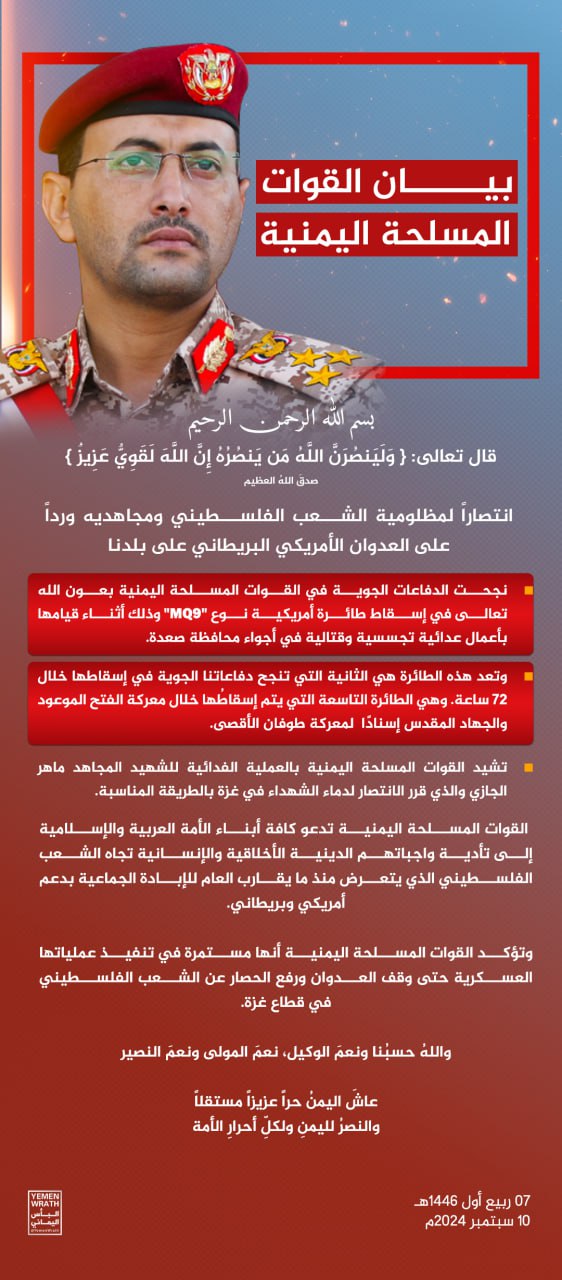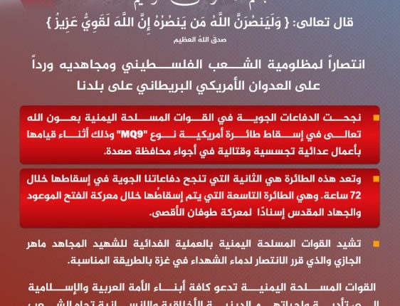 صور بيان القوات المسلحة اليمنية بشأن إسقاط طائرة أمريكية من نوع MQ9 في أجواء محافظة صعدة (إنفوجرافيك) يمانيون/ صور بيان القوات المسلحة اليمنية بشأن إسقاط طائرة أمريكية من نوع MQ9 في أجواء محافظة صعدة Share