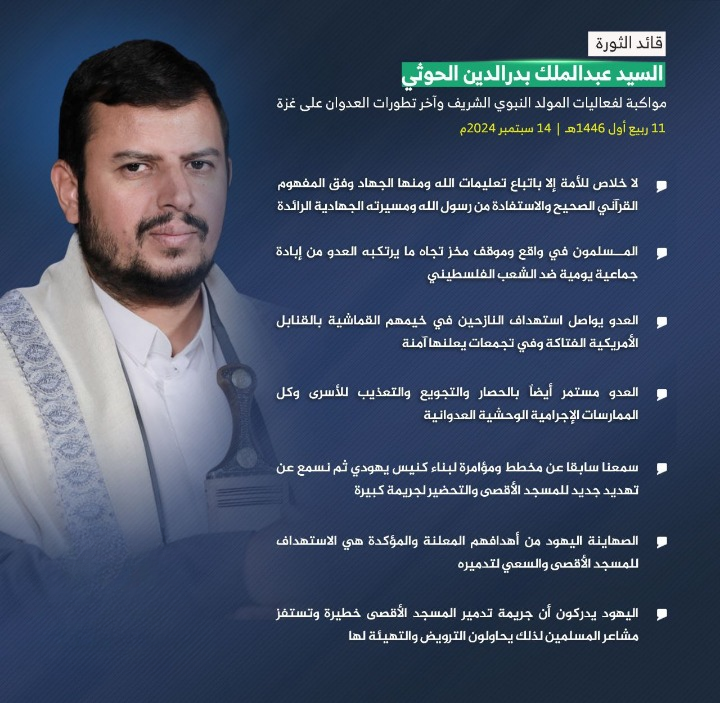 السيد القائد عبدالملك بدرالدين الحوثي في كلمة له مواكبةَ لفعاليات المولد النبوي الشريف وآخر تطورات العدوان على غزة – 11 ربيع أول 1446هـ: