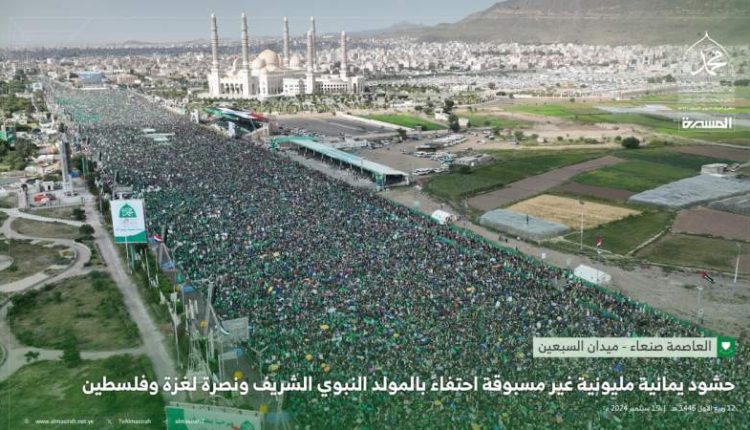 حشود مليونية بالعاصمة صنعاء هي الأضخم عالميا إحياء لذكرى المولد النبوي ونصرة لغزة (فيديو + صور)
