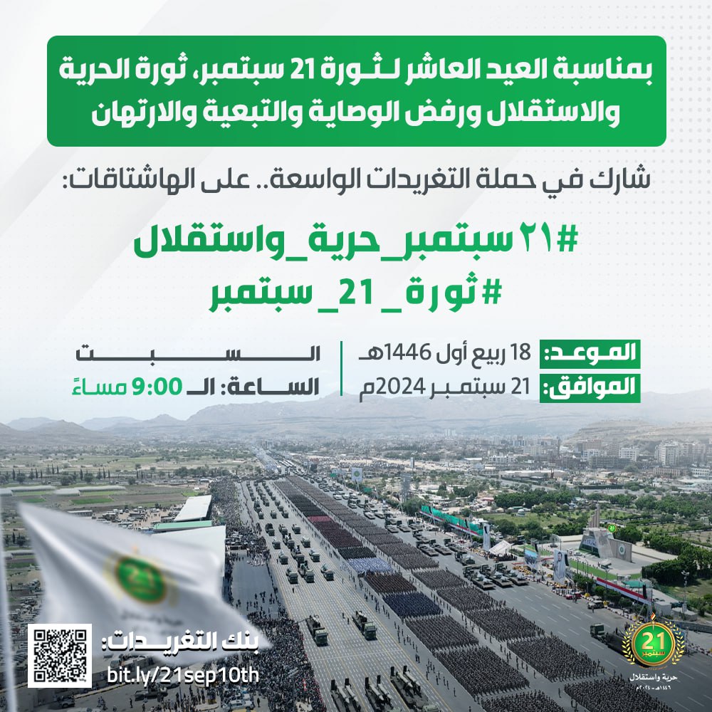 تنطلق عند الساعة التاسعة مساء، اليوم السبت، حملة تغريدات على موقع التواصل الاجتماعي “أكس”، بمناسبة العيد العاشر لـ ثورة 21 سبتمبر، ثورة الحرية والاستقلال ورفض الوصاية والتبعية والارتهان.