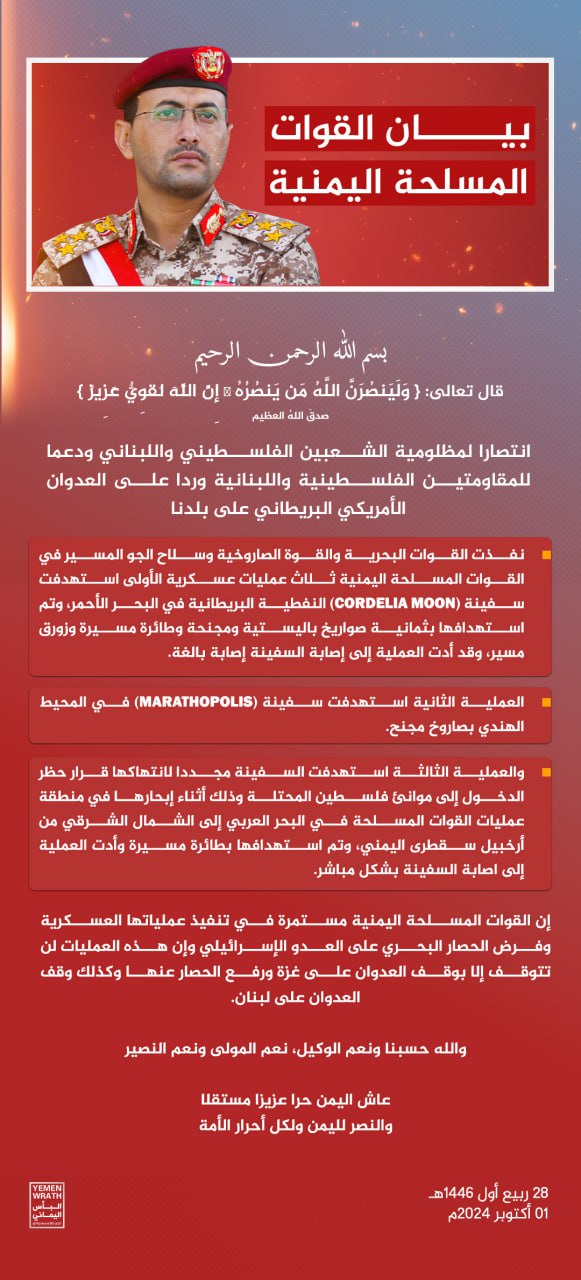 بيان القوات المسلحة اليمنية بشأن تنفيذ 3 عمليات عسكرية في إطار فرض الحصار البحري على العدو الإسرائيلي وردا على العدوان الأمريكي البريطاني 28-03-1446هـ | 01-10-2024م (إنفوجرافيك)