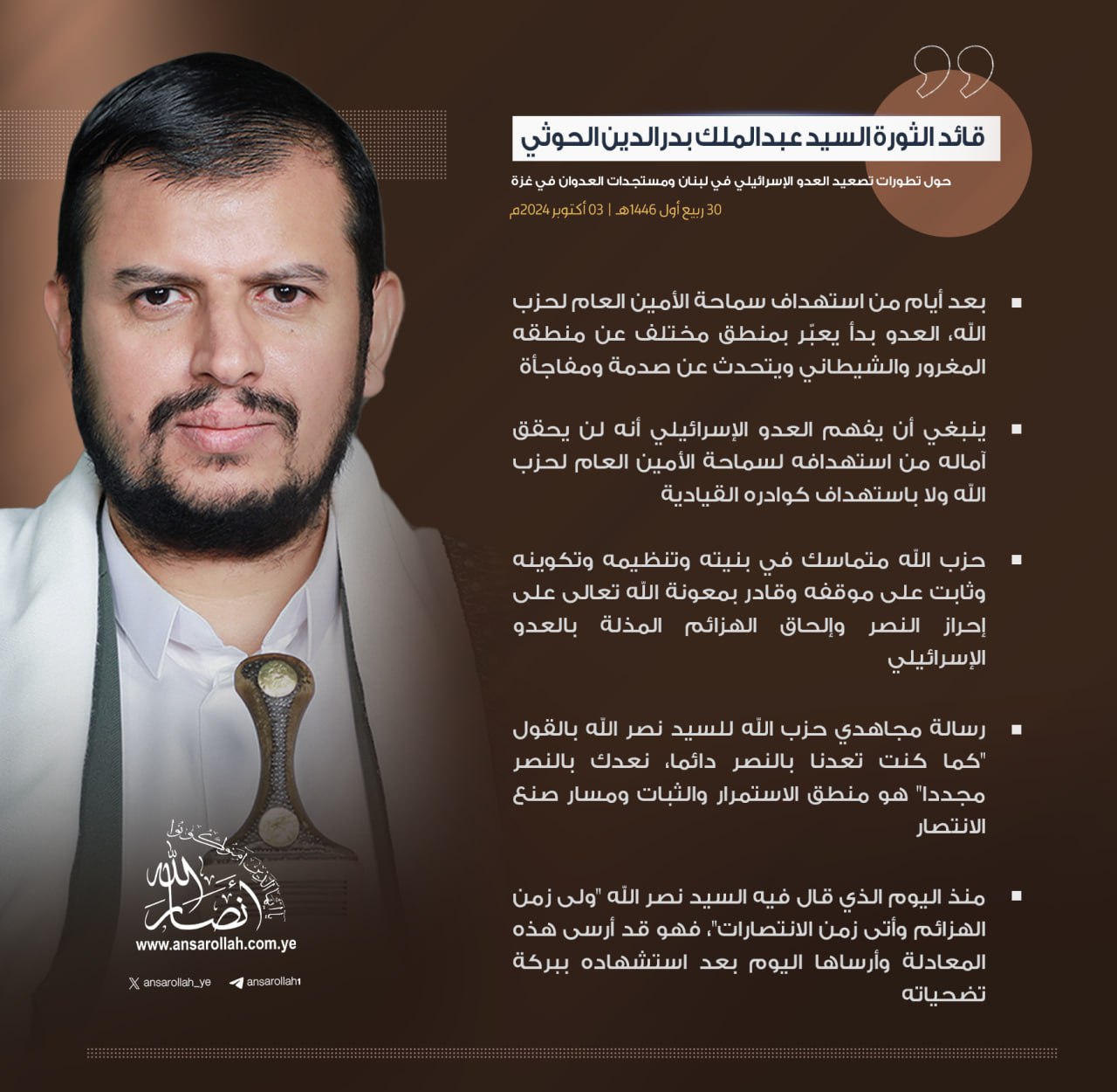 إنفوجرافيك| كلمة السيد القائد عبدالملك بدرالدين الحوثي حول آخر تطورات العدوان الإسرائيلي على غزة و لبنان والمستجدات الإقليمية والدولية 30 ربيع الأول 1446هـ – 3 أكتوبر 2024م