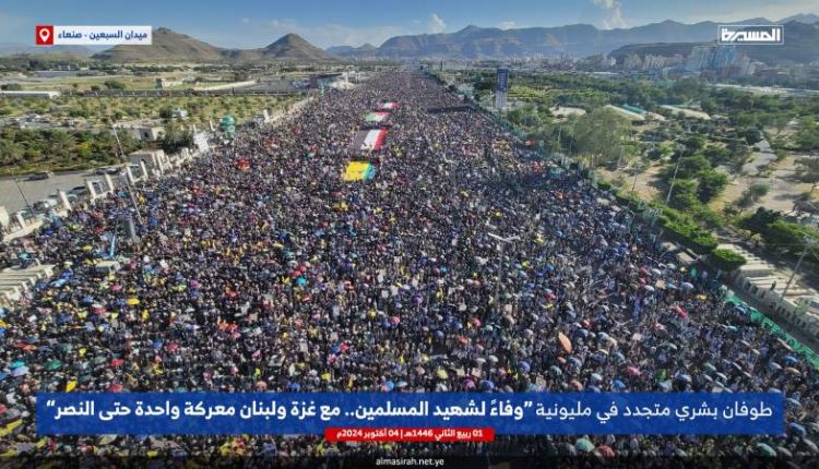 وشهد ميدان السبعين بالعاصمة صنعاء، في 6 من سبتمبر 2024، الطوفان المليوني الـ48 متجددا إسنادا للشعب الفلسطيني تحت شعار “مولد نبي الهدى.. دعوة لنصرة غزة والأقصى”.