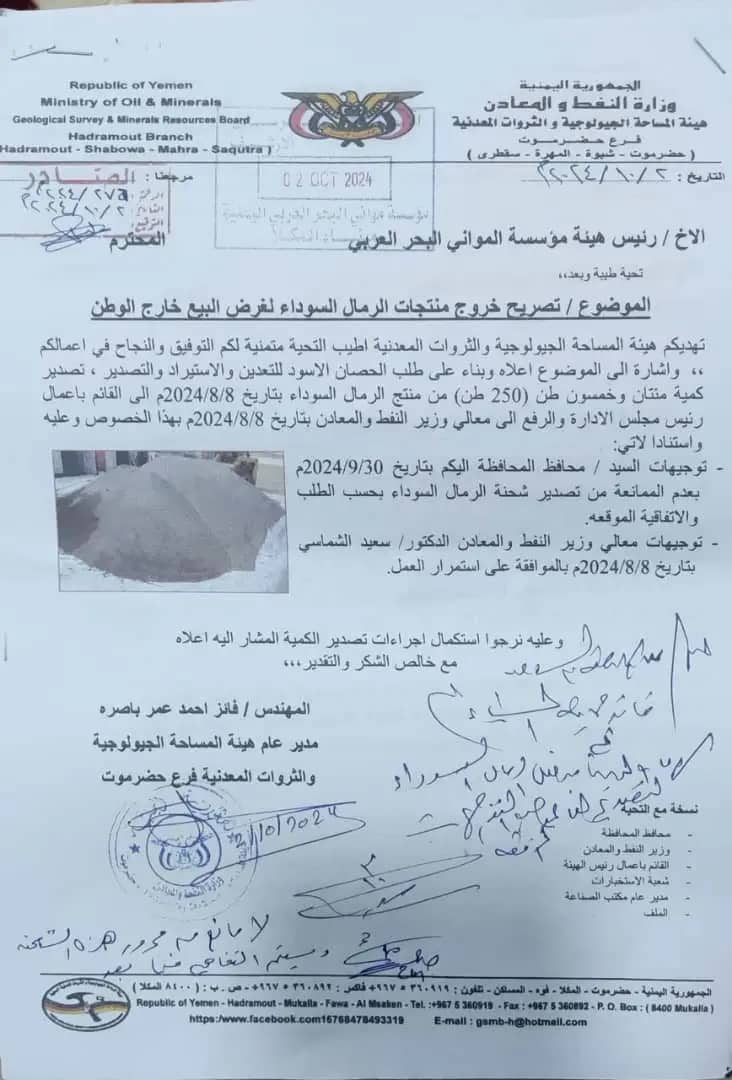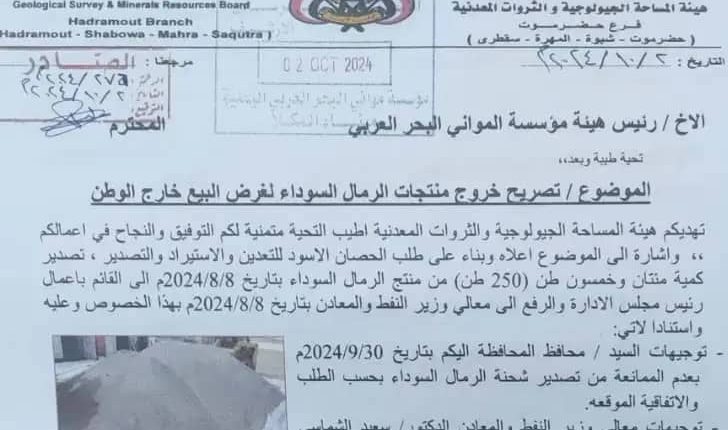 وأظهرت الوثائق الصادرة عن هيئة الجيولوجيا والمعادن في حضرموت، مطلع أُكتوبر الجاري، طلب الهيئة من مؤسّسة موانئ البحر العربي، السماح بخروج 250 طنًّا من الرمال السوداء بموجب مذكرة من شركة “الحصان الأسود” عطفًا على توجيهات وزير النفط في حكومة المرتزِقة، سعيد الشماسي، ومنتحل صفة محافظ حضرموت المرتزِق، مبخوت بن ماضي؛ لبيعها في الخارج دون تحديد مصير قيمتها.