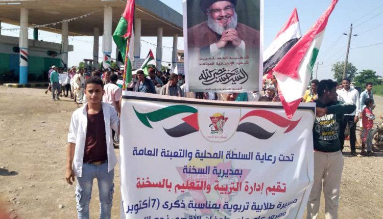 مسيرة طلابية بمديرية السخنة محافظة الحديدة بمناسبة الذكرى الأولى لطوفان الأقصى