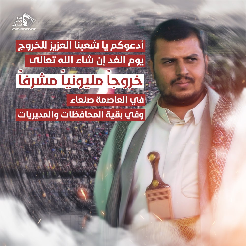 أدعوكم يا شعبنا العزيز للخروج يوم الغد إن شاء الله تعالى خروجاً مليونياً كبيراً في العاصمة صنعاء وفي بقية المحافظات والمديريات