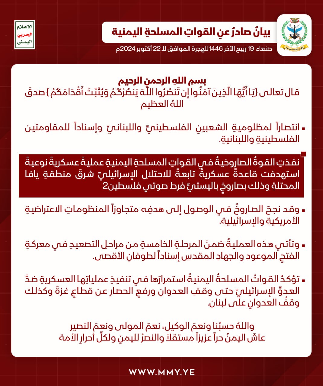 بيان القوات المسلحة اليمنية بشأن تنفيذ عملية عسكرية استهدفت قاعدةً عسكرية للعدو الصهيوني شرق منطقة يافا المحتلة “تل أبيب” بصاروخ باليستي فرط صوتي نوع “فلسطين2” بتاريخ 22-10-2024م
