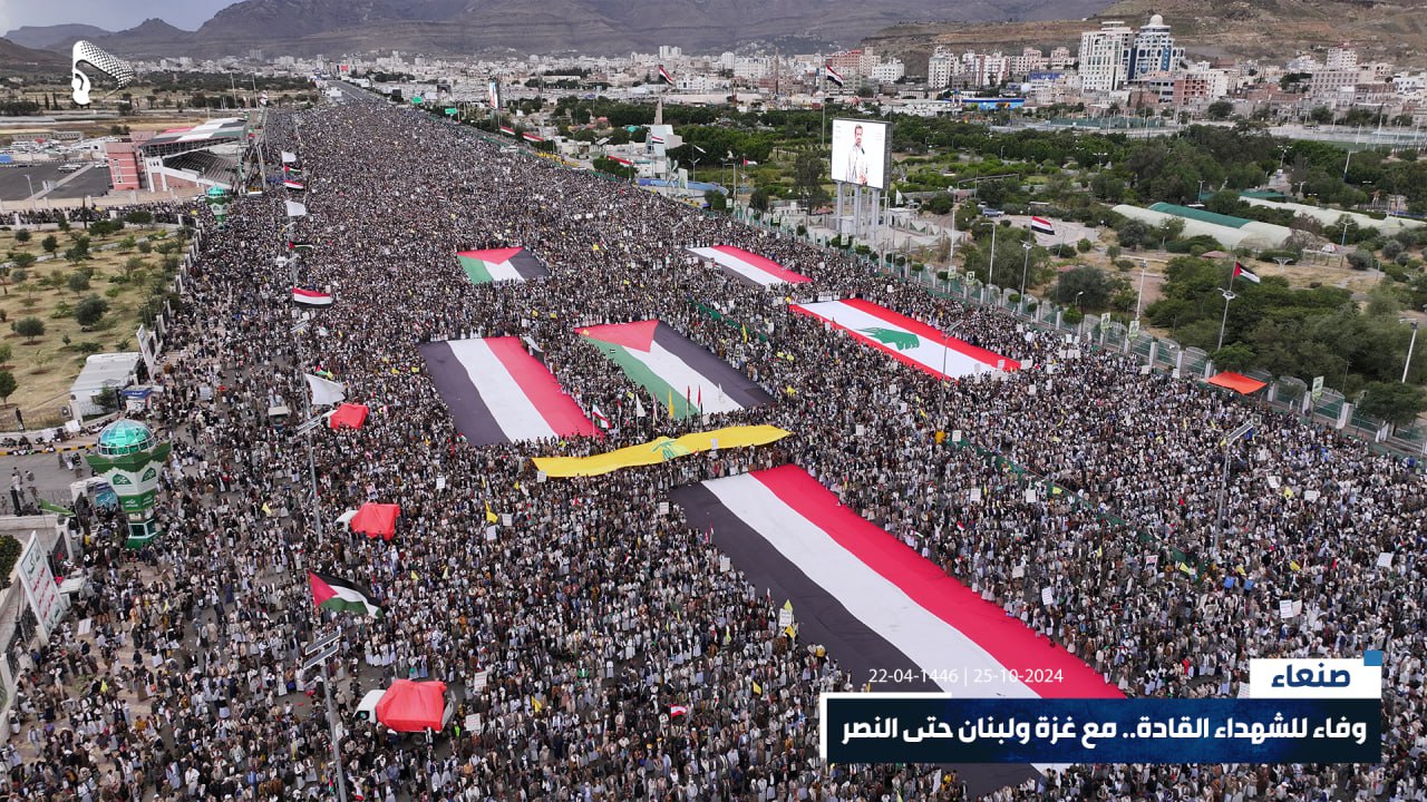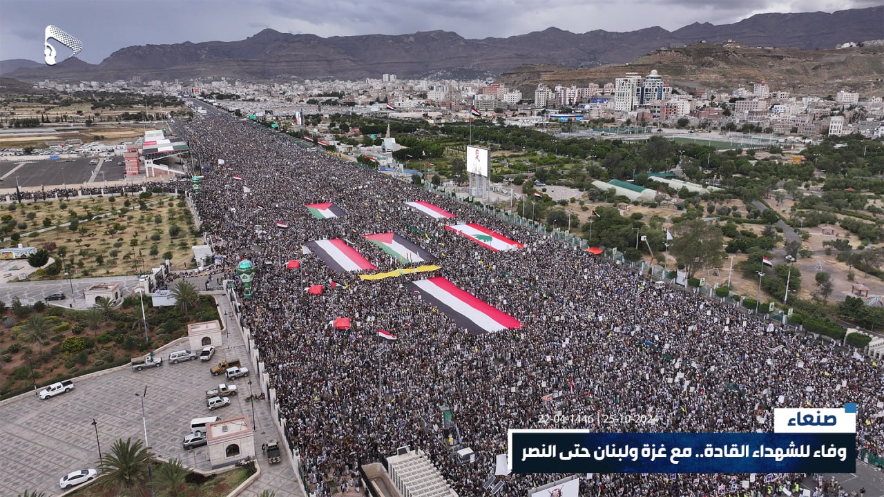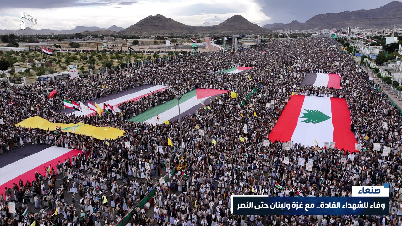 صور جوية | في ذروة الصمت والتخاذل، جبهة يمن الإيمان مستمرة والشعب حاضر وجاهز للمعركة.. حشود مليونية في مسيرة “وفاء للشهداء القادة.. مع غزة ولبنان حتى النصر” بميدان السبعين في العاصمة صنعاء 22-04-1446هـ | 25-10-2024م