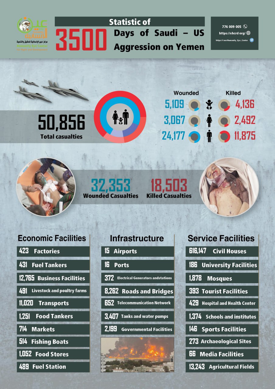 ووثق المركز أن إجمالي الشهداء والجرحى خلال 3,500 يوم من العدوان السعودي الأمريكي، بلغ 50,856 مدني بينهم 18,503 شهيداً و32,353 جريحاً.