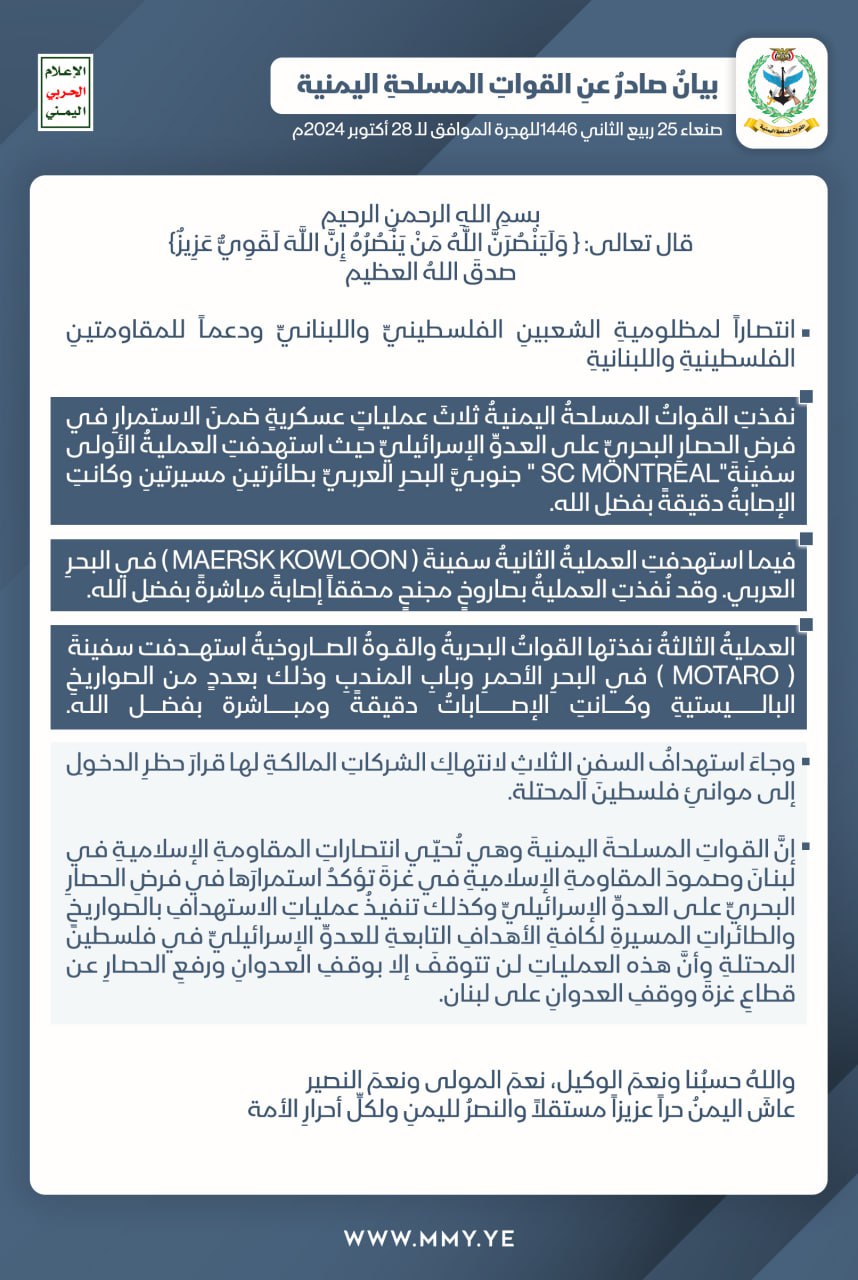 بيان القوات المسلحة اليمنية بشأن تنفيذ ثلاث عمليات عسكرية استهدفت سفينتي (SC MONTREAL) و(MAERSK KOWLOON) في البحر العربي وسفينة (MOTARO) في البحرِ الأحمر، وذلك لانتهاك الشركات المالكة لها قرار حظر الدخول إلى موانئ فلسطين المحتلة – 28 أكتوبر 2024م