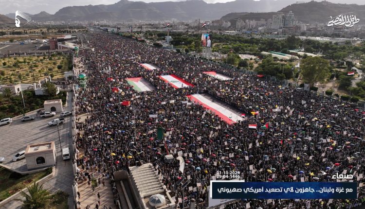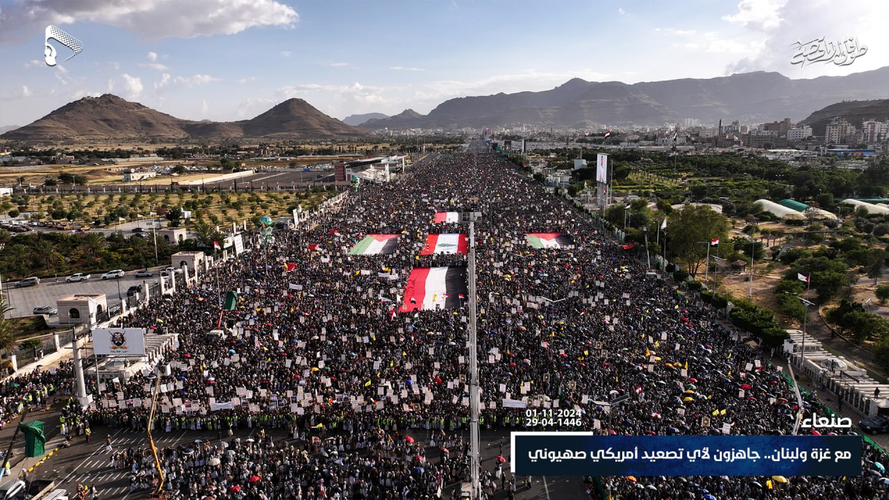 صور جوية | طوفان متجدد في العاصمة #صنعاء سيجرف كل المتآمرين والأعداء في مسيرة “مع غزة ولبنان.. جاهزون لأي تصعيد أمريكي صهيوني” 29-04-1446هـ | 01-11-2024م