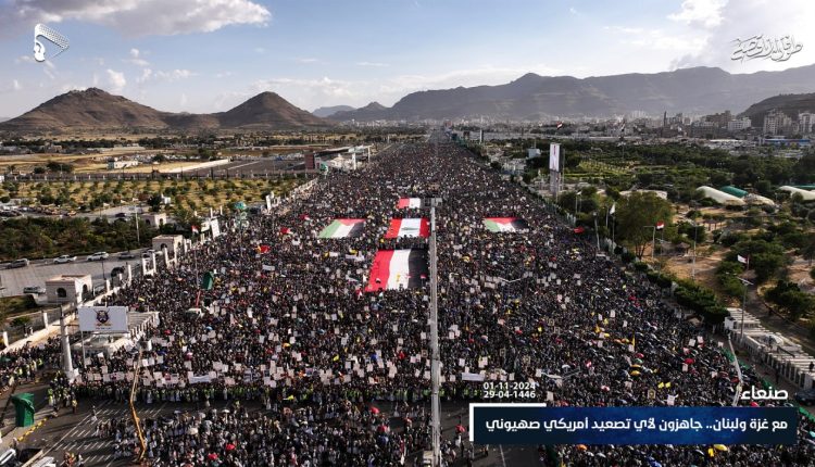 طوفان بشري وحشود مليونية تملأ ميدان السبعين بالعاصمة صنعاء تؤكد جهوزيتها لمواجهة أي تصعيد للعدو الأمريكي والصهيوني