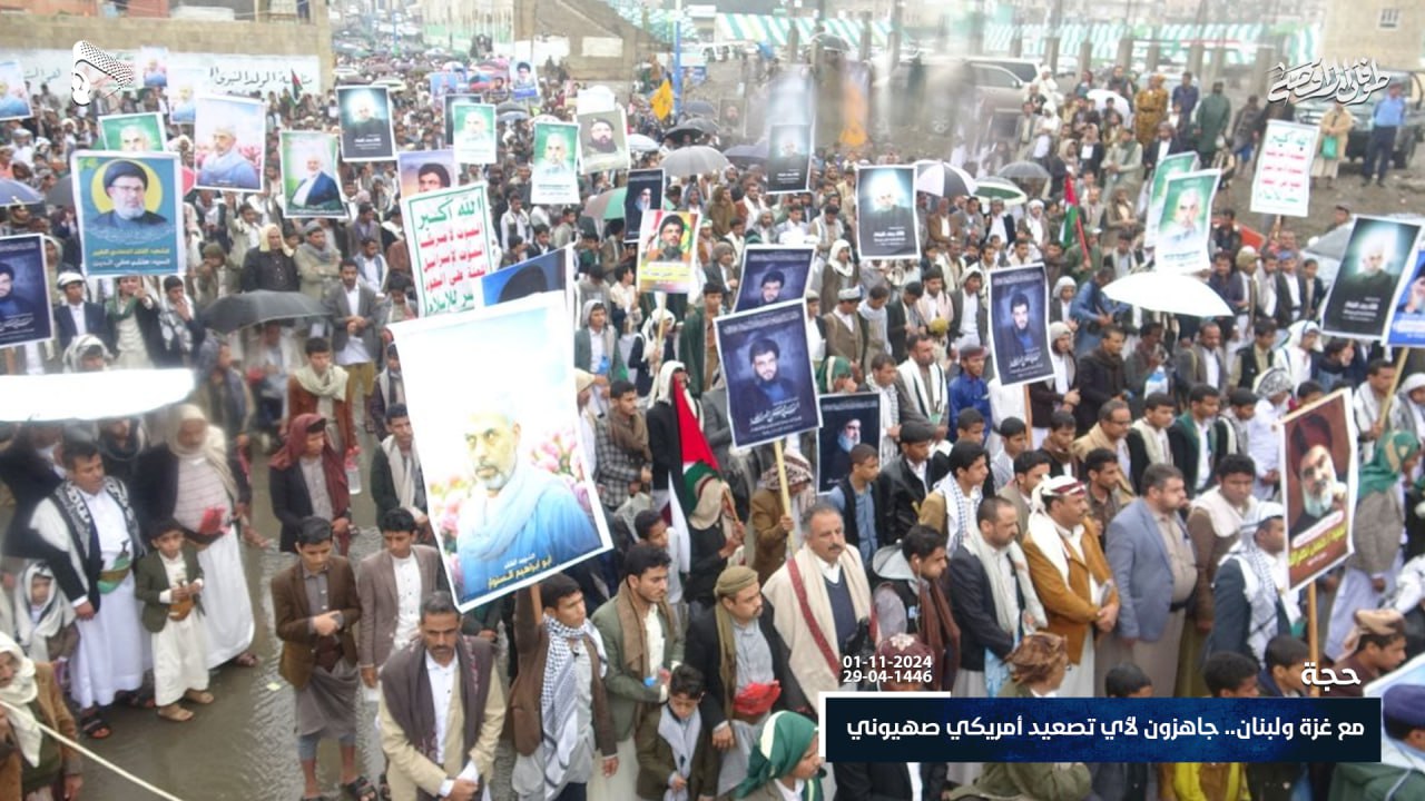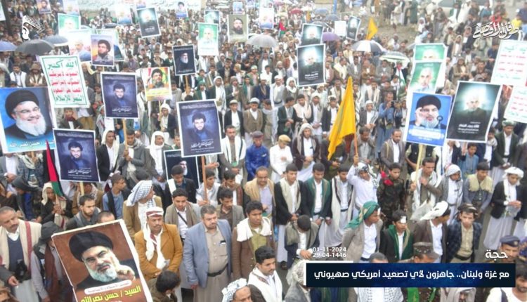 أبناء محافظة حجة يحتشدون في مسيرات جماهيرية كبرى تضامناً مع الشعبين الفلسطيني واللبناني
