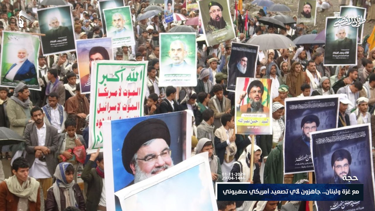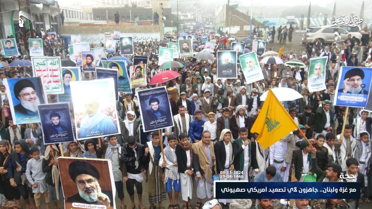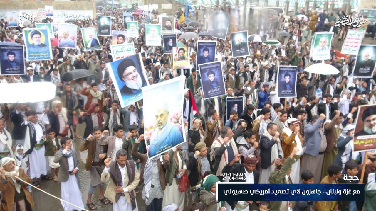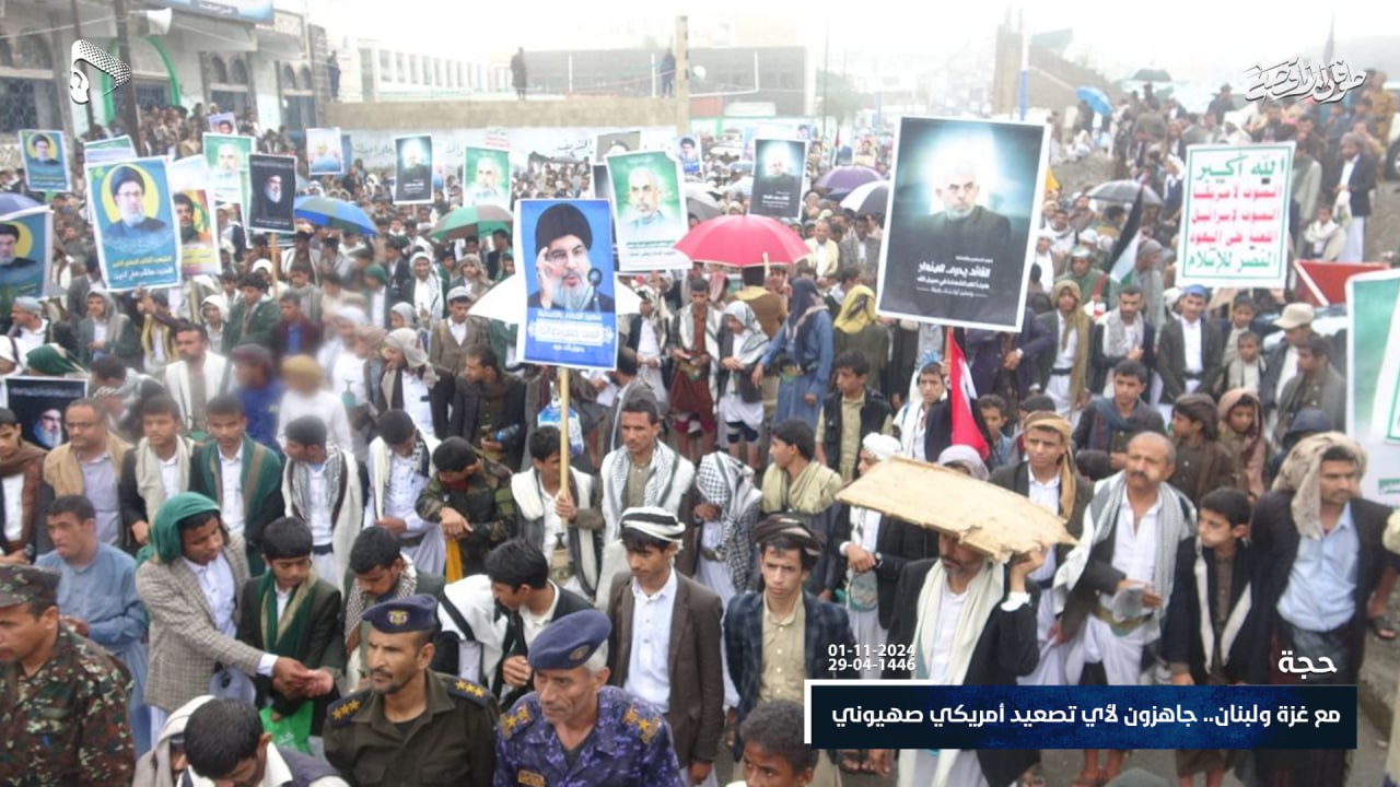 خرج أبناء محافظة حجة اليوم الجمعة ، في مسيرات حاشدة تحت شعار “مع غزة ولبنان.. جاهزون لأي تصعيد أمريكي صهيوني” تضامناً مع الشعبين الفلسطيني واللبناني.