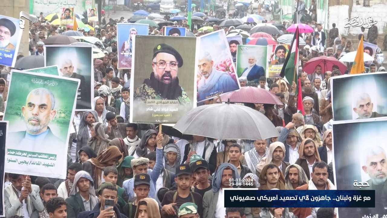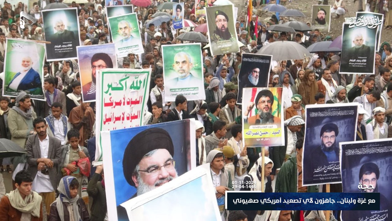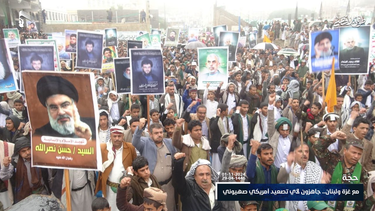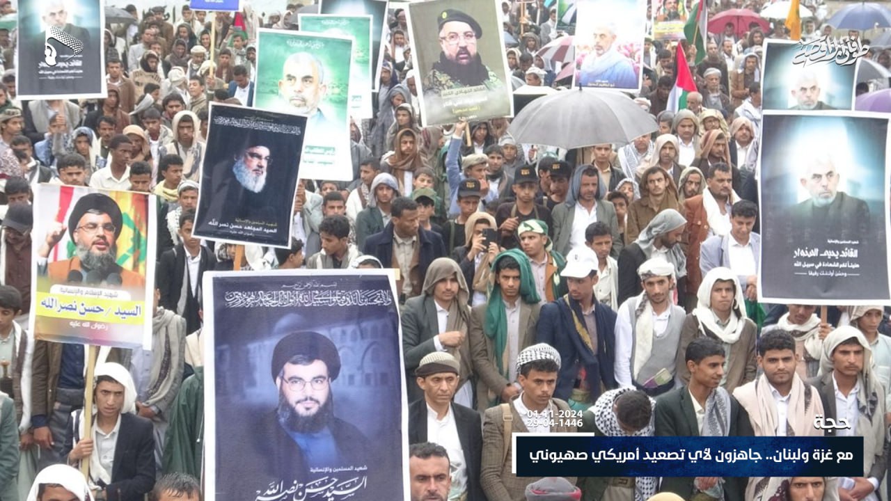 خرج أبناء محافظة حجة اليوم الجمعة ، في مسيرات حاشدة تحت شعار “مع غزة ولبنان.. جاهزون لأي تصعيد أمريكي صهيوني” تضامناً مع الشعبين الفلسطيني واللبناني.