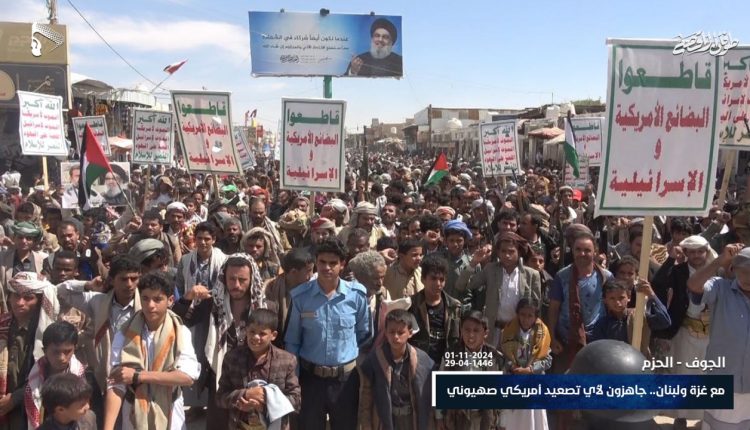 وندد أبناء الجوف باستمرار العدو الصهيوني في ارتكاب الجرائم المروعة بحق النساء والأطفال والإبادة الجماعية للمدنيين في غزة ولبنان.