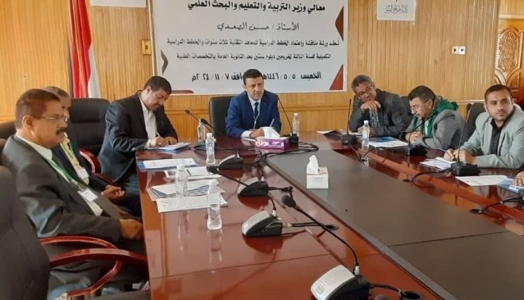 ناقش 25 مختصا وأستاذا جامعيا، اليوم، متطلبات اعتماد الخطط الدراسية للمعاهد الفنية نظام ثلاث سنوات، للعام (2024 – 2025م)، في ورشة عمل عُقدت، اليوم، في صنعاء.