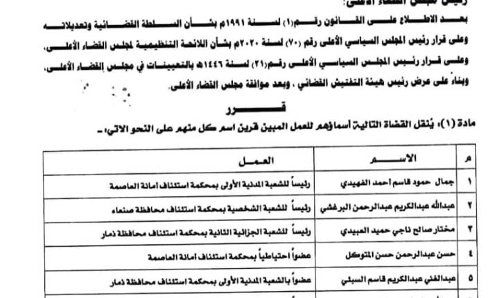 وجاء القرار برقم (25) لسنة 1446، ويشمل نقل 13 قاضيًا للعمل في مجموعة من المحافظات. سيتم تنفيذ هذه الحركة اعتبارًا من تاريخ صدور القرار،