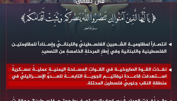شاهد| بيان القوات المسلحة اليمنية بشأن استهداف قاعدة “نيفاتيم” الجوية التابعة للعدو الإسرائيلي في منطقة النقب (إنفوجرافيك)