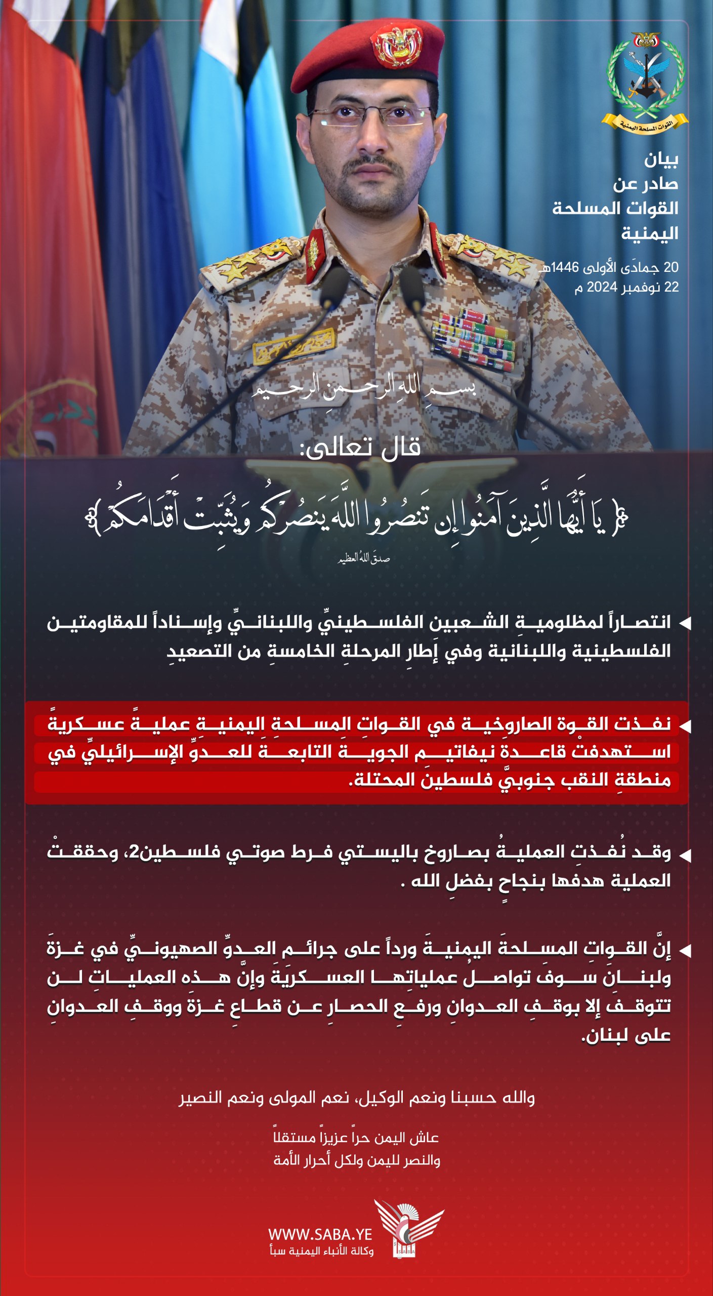 شاهد| بيان القوات المسلحة اليمنية بشأن استهداف قاعدة “نيفاتيم” الجوية التابعة للعدو الإسرائيلي في منطقة النقب جنوبي فلسطين المحتلة بصاروخ فرط صوتي “فلسطين2” 20-05-1446هـ 22-11-2024م (إنفوجرافيك)