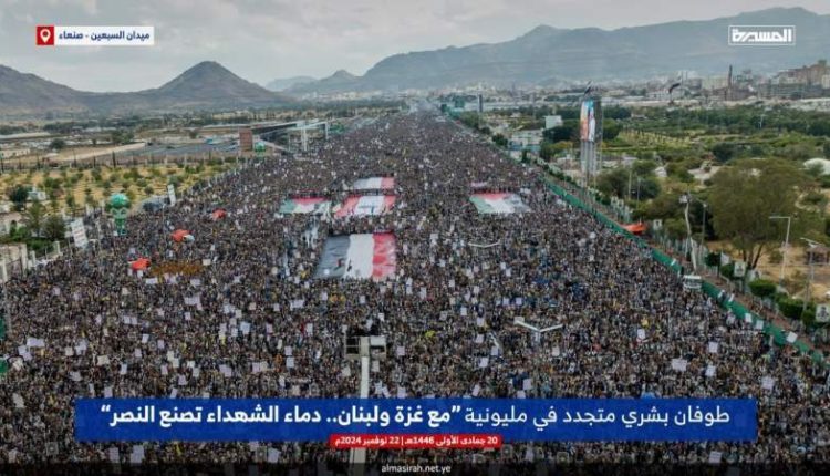 وسط زخات المطر، وبرودة الشتاء، يخرج الشعب اليمني بمختلف فئاته العمرية إلى ميادين وساحات النصرة والإسناد للشعبين الفلسطيني واللبناني.