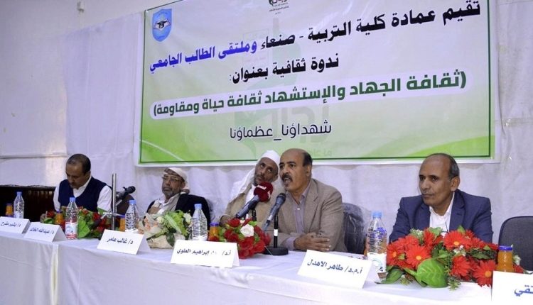 نظمت كلية التربية و ملتقى الطالب الجامعي بجامعة صنعاء اليوم ندوة ثقافية بعنوان ” ثقافة الجهاد والإستشهاد ثقافة حياة ومقاومة ” تحت شعار شهداؤنا عظماؤنا “.