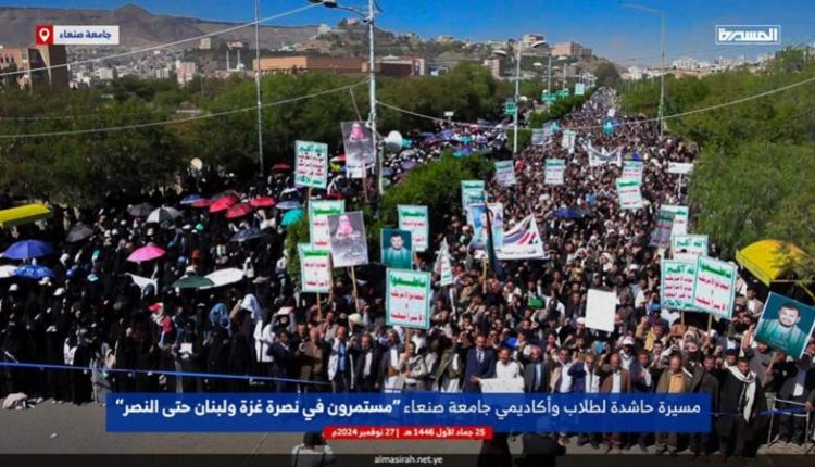 مسيرة حاشدة في جامعة صنعاء تحت شعار “مستمرون في نصرة غزة ولبنان حتى النصر”