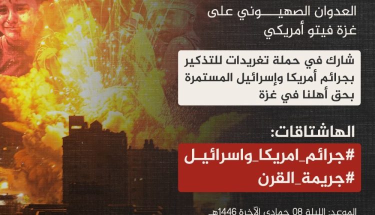 التاسعة مساءً بتوقيت صنعاء …حملة تغريدات للتذكير بجرائم أمريكا وإسرائيل في غزة