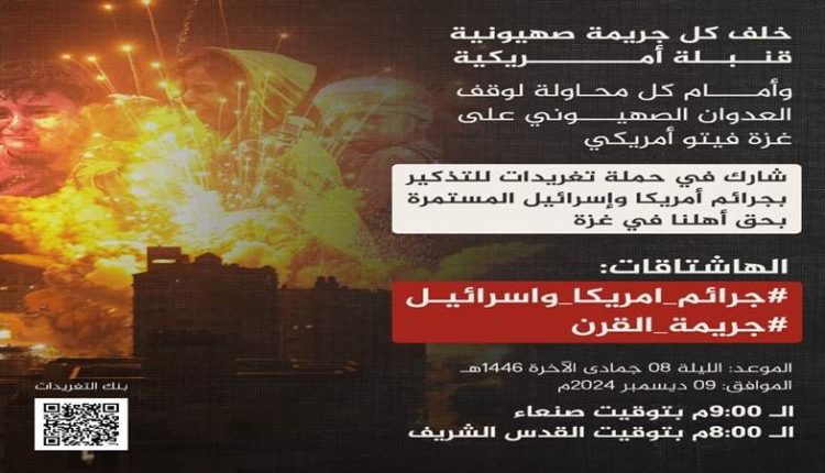 يجري الآن: انطلاق حملة تغريدات لكشف جرائم أمريكا والكيان الصهيوني في غزة