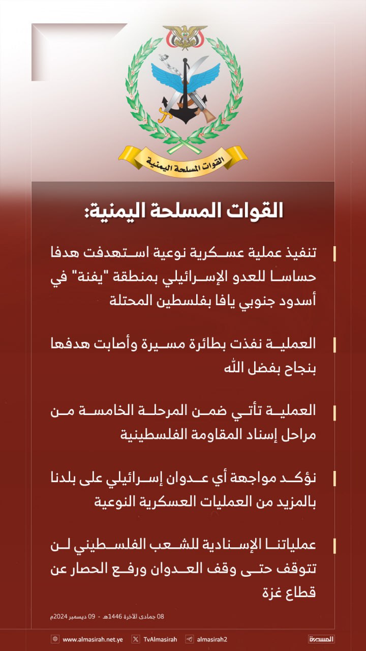 بيان القوات المسلحة اليمنية بشأن تنفيذ عملية عسكرية نوعية استهدفت هدفاً حساساً للعدوّ الإسرائيليّ بمنطقة “يفنة” في أسدود جنوبيَّ يافا بفلسطين المحتلة 08-06-1446هـ 09-12-2024م