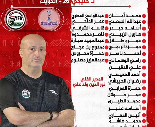 أعلن المدير الفني للمنتخب اليمني الأول لكرة القدم، الجزائري نور الدين ولد علي، القائمة النهائية التي ستخوض غمار بطولة كأس الخليج العربي الـ26 “خليجي 26″، المقررة إقامتها في دولة الكويت خلال الفترة من 21 ديسمبر 2024 وحتى 3 يناير 2025.