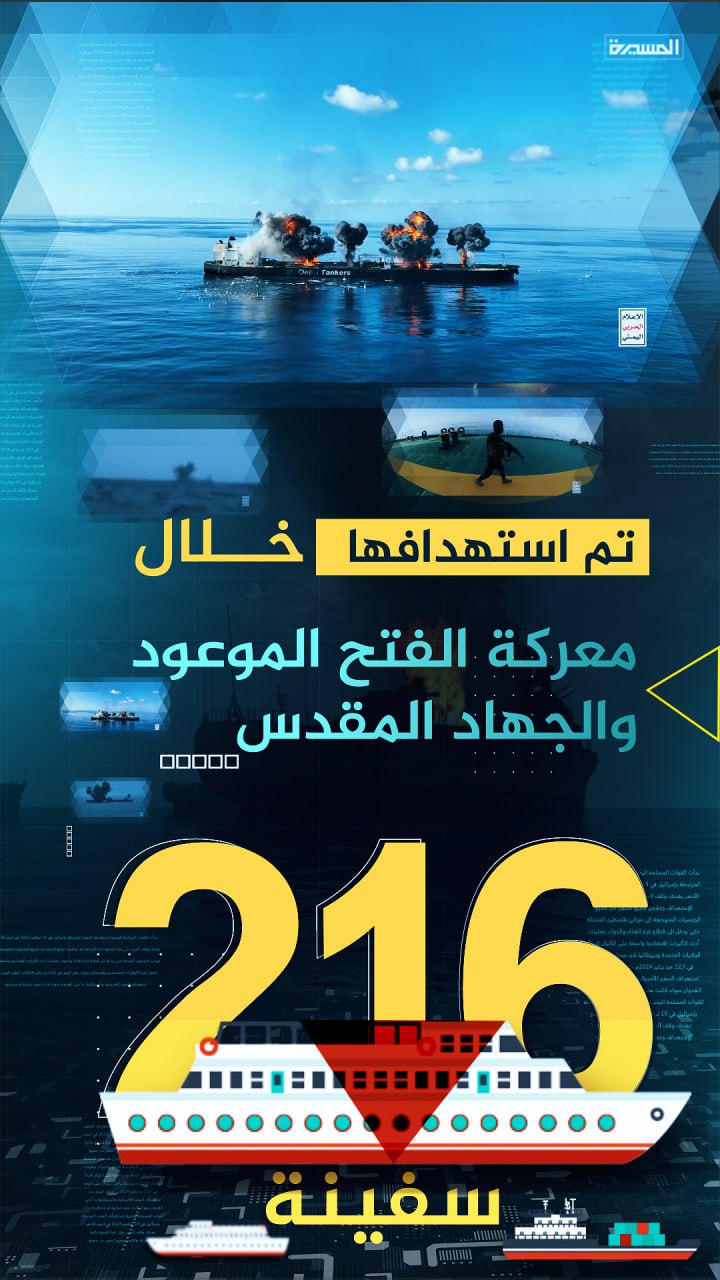 إنفوجرافيك| (216) حصيلة السفن المستهدفة من الجمهورية اليمنية والمرتبطة بالعدو الصهيوني خلال معركة الفتح الموعود والجهاد المقدس