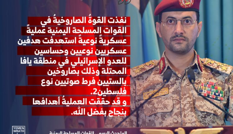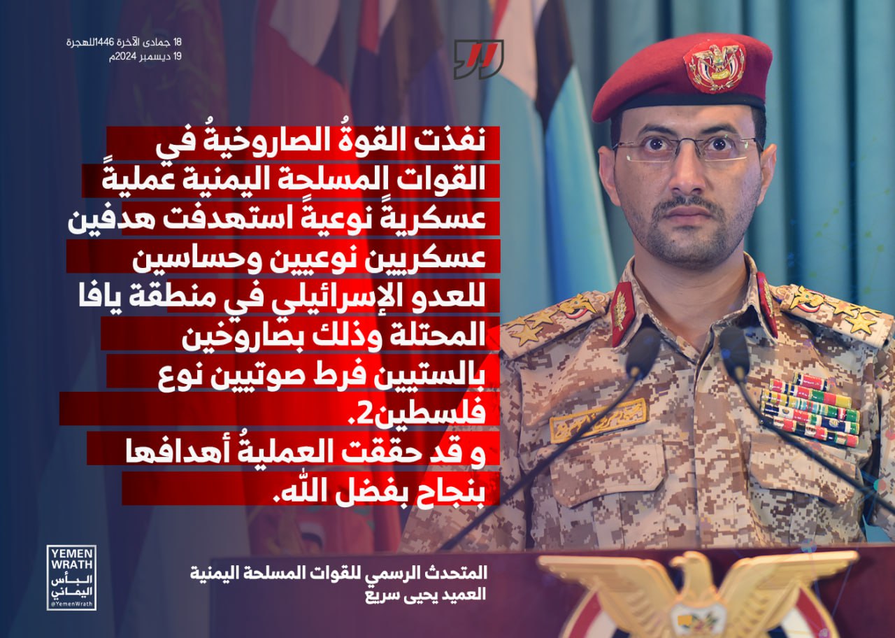 بيان القوات المسلحة اليمنية بشأن استهداف هدفين عسكريين نوعيين وحساسين للعدو الإسرائيلي في منطقة يافا المحتلة بصاروخين بالستيين فرط صوتيين نوع “فلسطين2” 18-06-1446هـ | 19-12-2024م