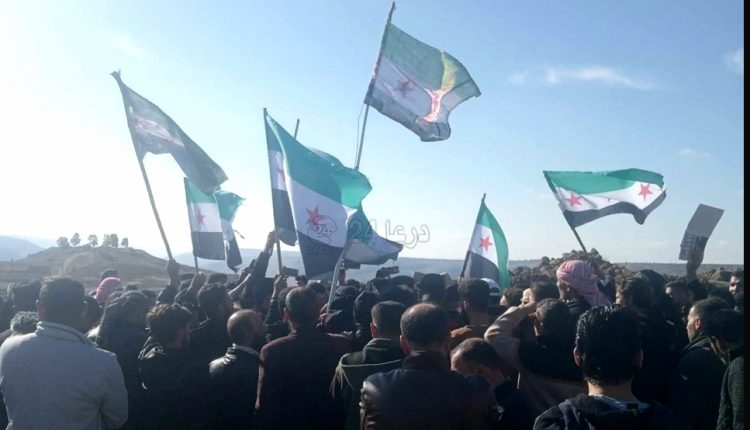 أهالي بلديات حوض اليرموك بريف درعا يتظاهرون ضد التوسع الإسرائيلي داخل الأراضي السورية