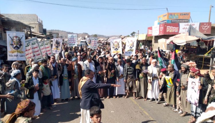 حيث شهدت مديريات مدينة المحويت وشبام كوكبان “بالجامع الكبير وسوق بادية” وكوكبان والطويلة والرجم بـ “ساحة الرسول الأعظم”، وسهل باقل والخبت “المرواح ومنطقة الظاهر” وجبع ونمرة وبني سعد بـ”مركز المديرية”، وسوق الأحد وسوق الجمعة وهواع وملحان بـ”مركز المديرية”، ومنطقة بني الحجاج والروضة والشجاف وبدحة وهمان المذاب وهباط وملحان الشماسنة والقبلة المركع والأحبول وجبل المحويت “العرقوب وسوق الأحد والاحجول”، وحفاش بـ”مركز المديرية الصفقين والملاحنة”، وراود وجبل نعمان وبني أحمد، مسيرات حاشدة تقدّمها وكلاء المحافظة وقيادات محلية وتنفيذية وأمنية.