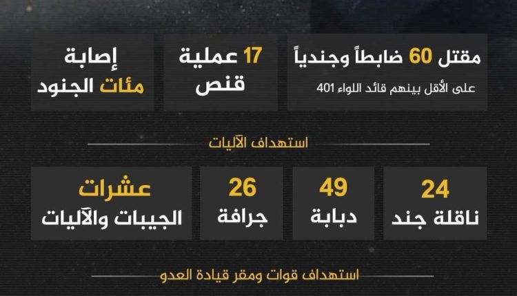 المقاومة تنفذ عمليات نوعية ضد الاحتلال، تسفر عن مقتل 60 جنديًا وإصابة المئات، واستهداف عشرات الآليات العسكرية